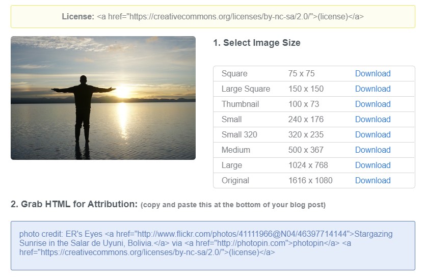 「1.select image size」から好きなサイズをダウンロードして、「2.Grab HTML for Attribution」のクレジット表記をコピーしておきましょう。